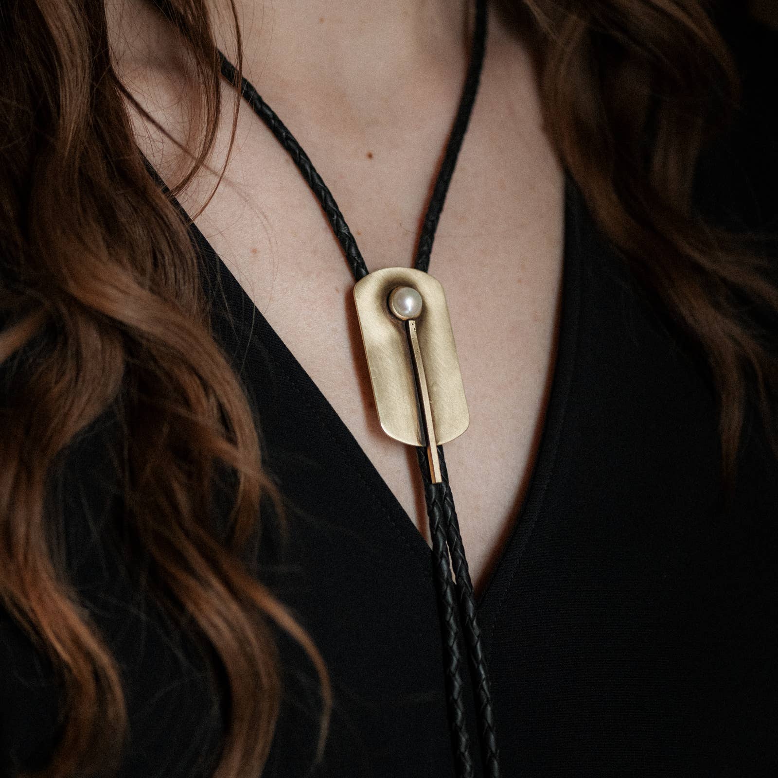 A brushed, hand-patinaed, solid brass 50mm x 28mm layered pendant with a bezel set with turquoise or pearl on black or light brown leather cord with solid brass tips, and a hinged tension clasp for easy adjusting. These handmade pieces are our modern interpretation of a classic style, created with versatility, quality, functionality, and personal expression in mind.