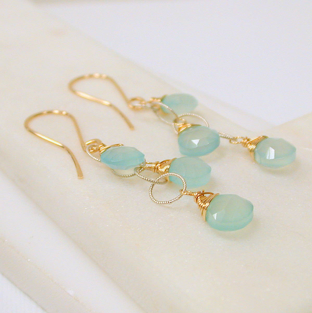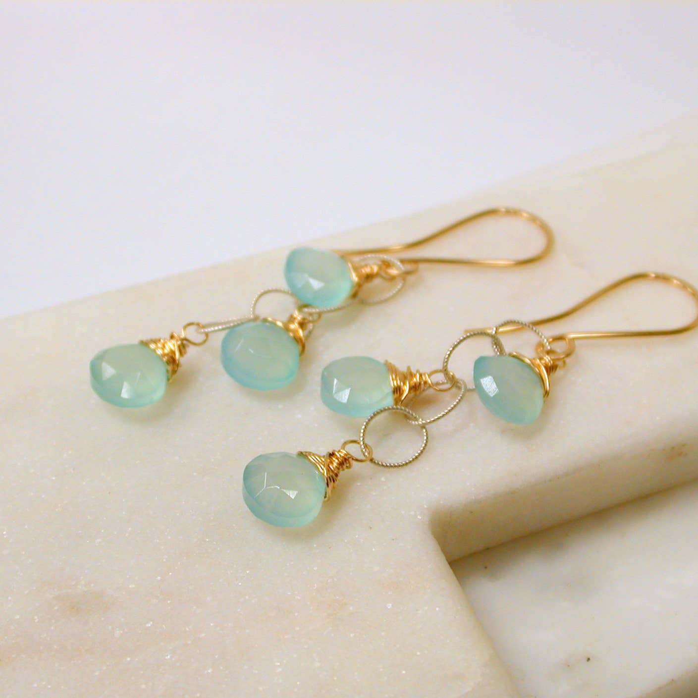 Three faceted drops of chalcedony in a wonderful aqua blue suspended from a chain and handmade ear wire. Mixed metals, wear them with gold or silver pairings!
