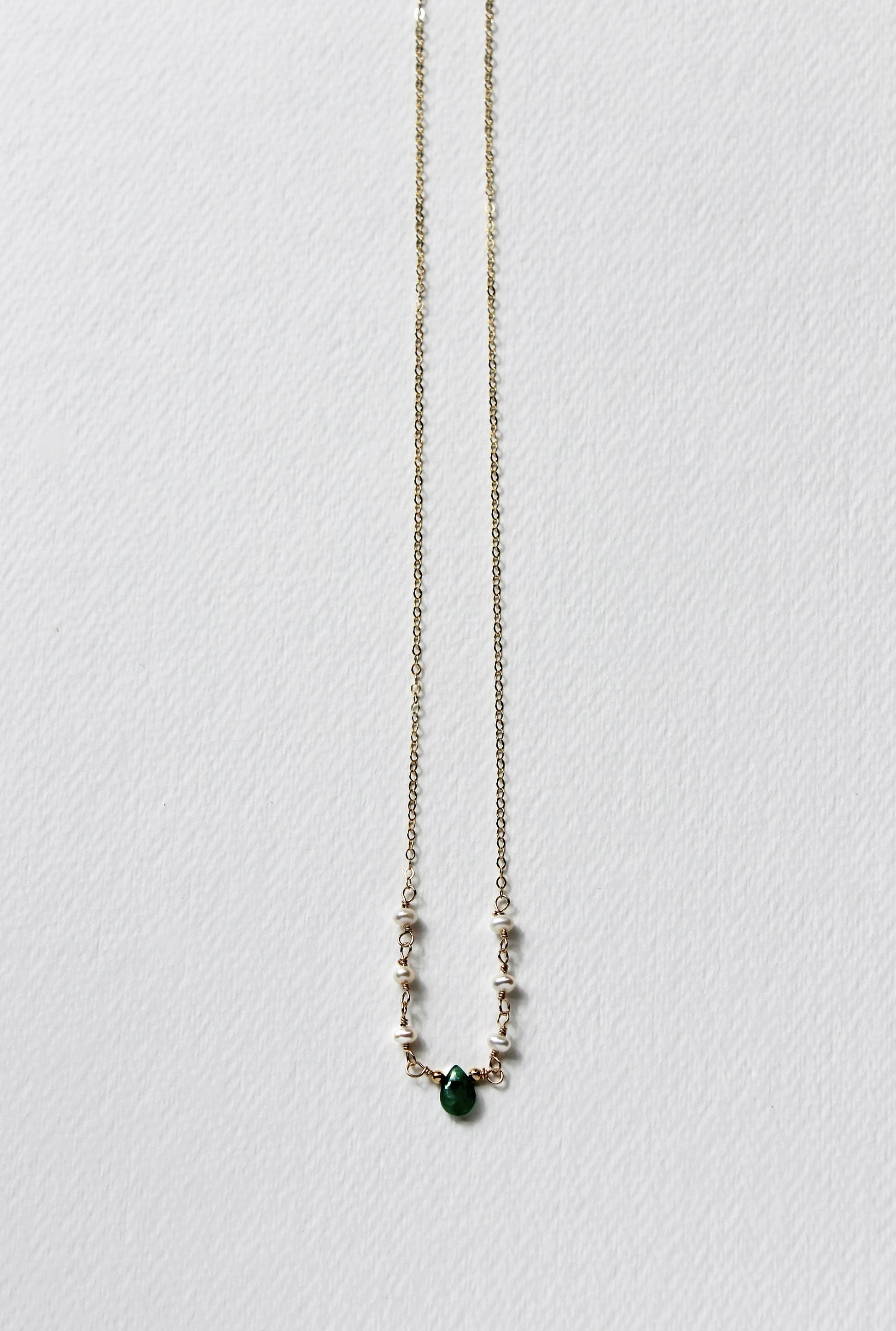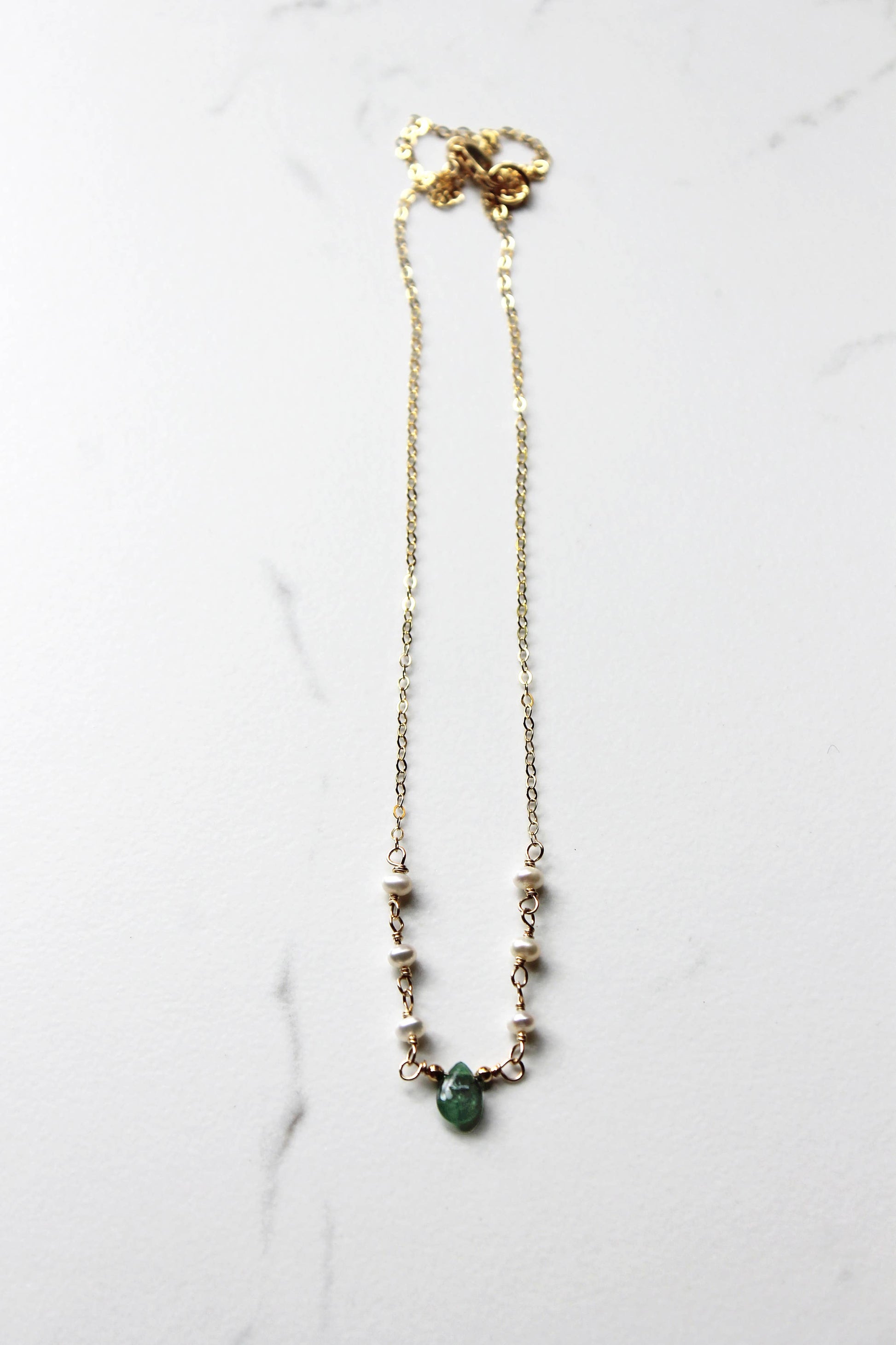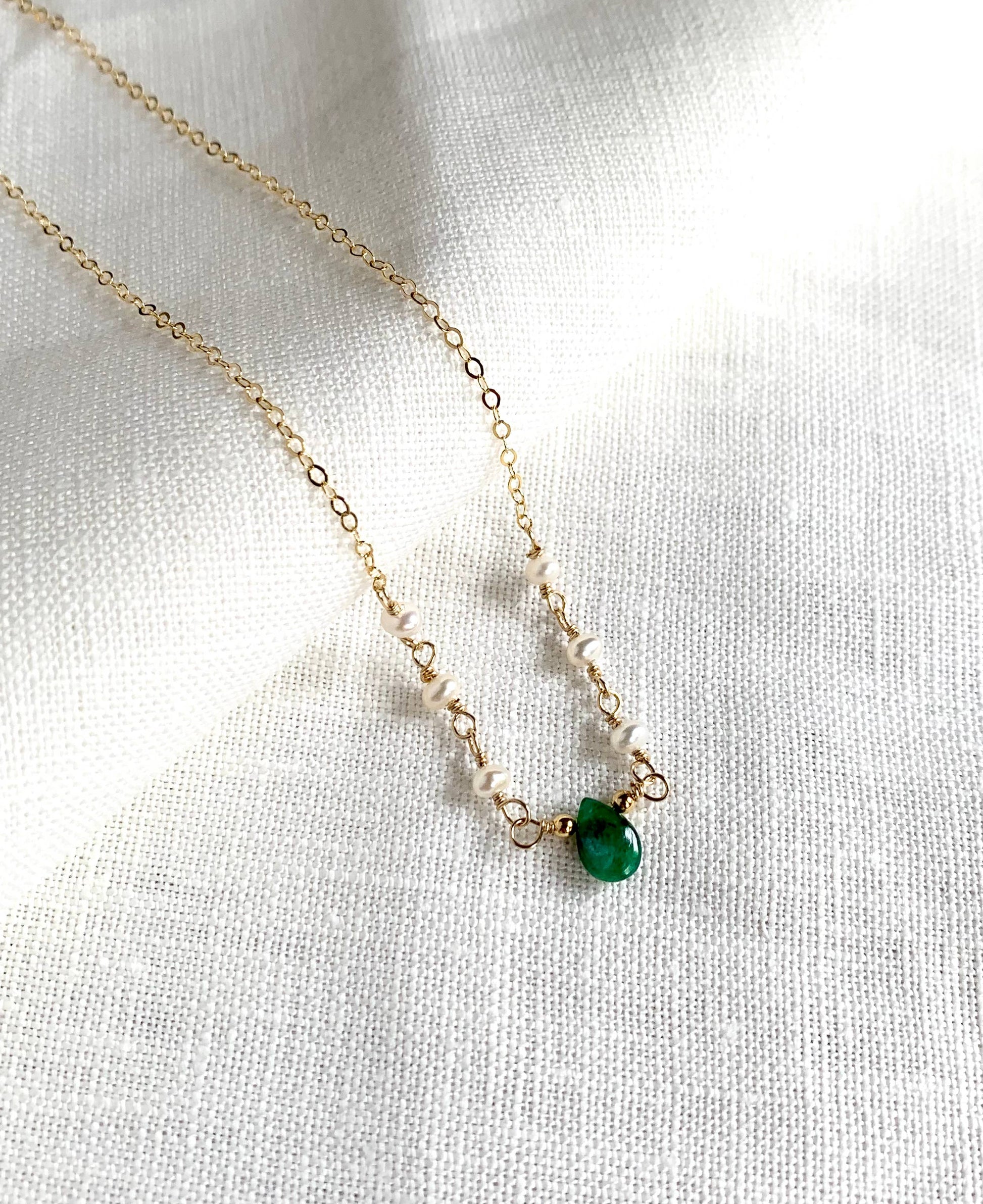 Dainty and light, a teardrop emerald takes center stage with pearls in the wings. Great for holiday outfits and summer dresses!