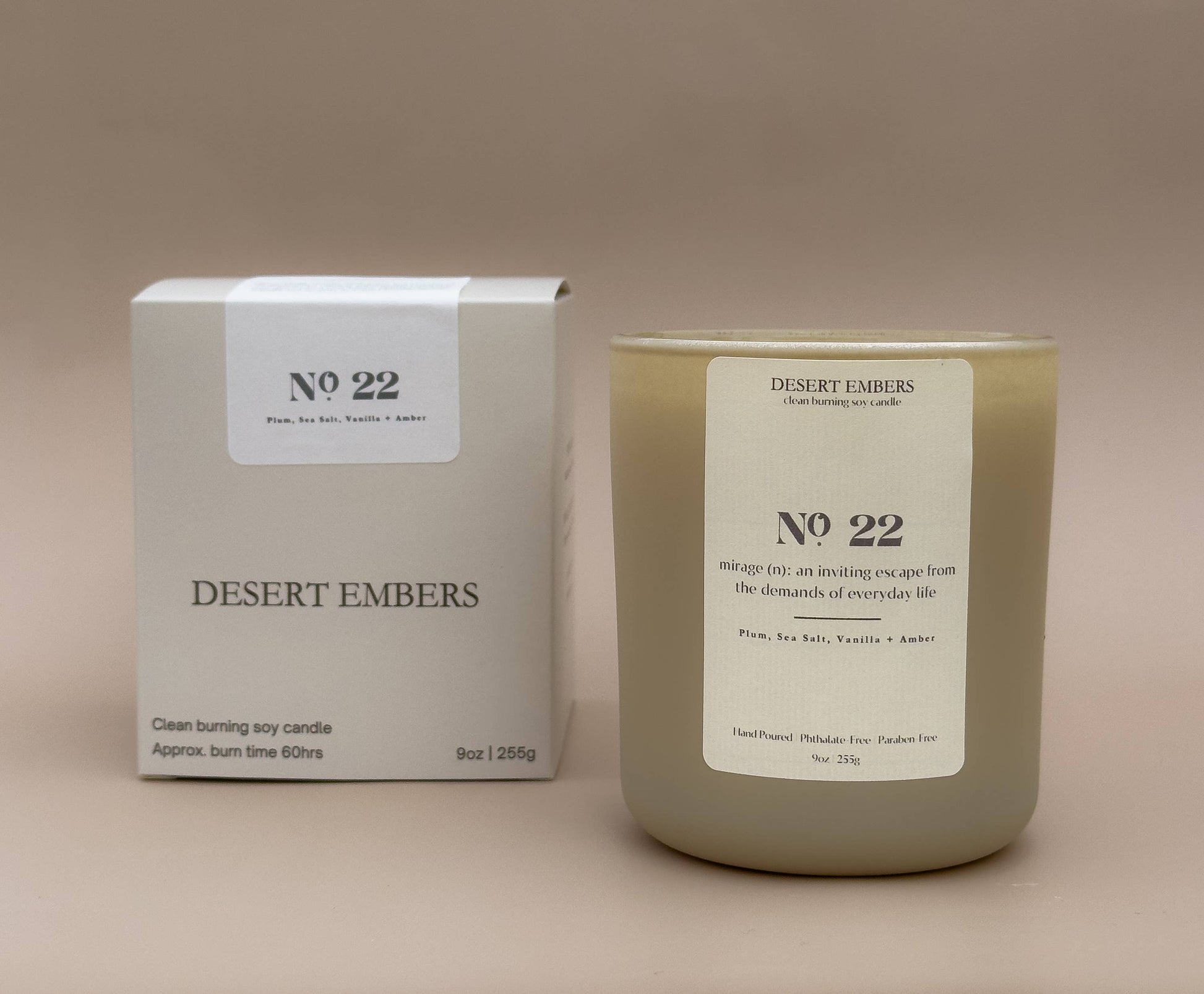 Desert Embers candles are made with a natural soy wax, phthalate-free fragrance oils, and one lead-free cotton wick. The beautiful, milky glass container makes for an elegant touch in any room.