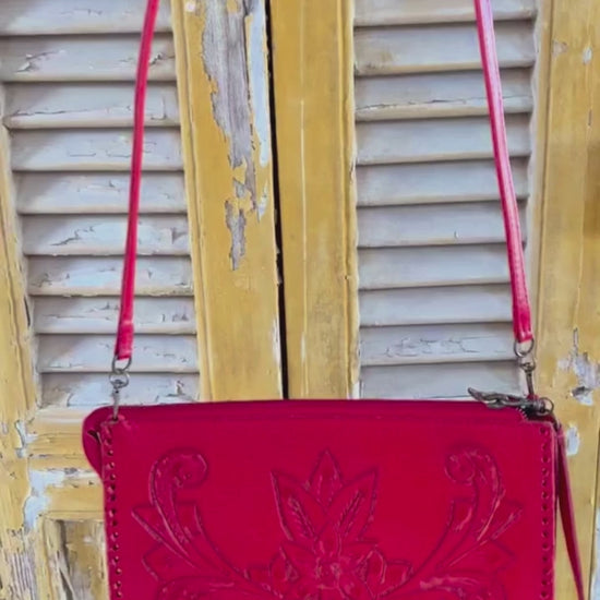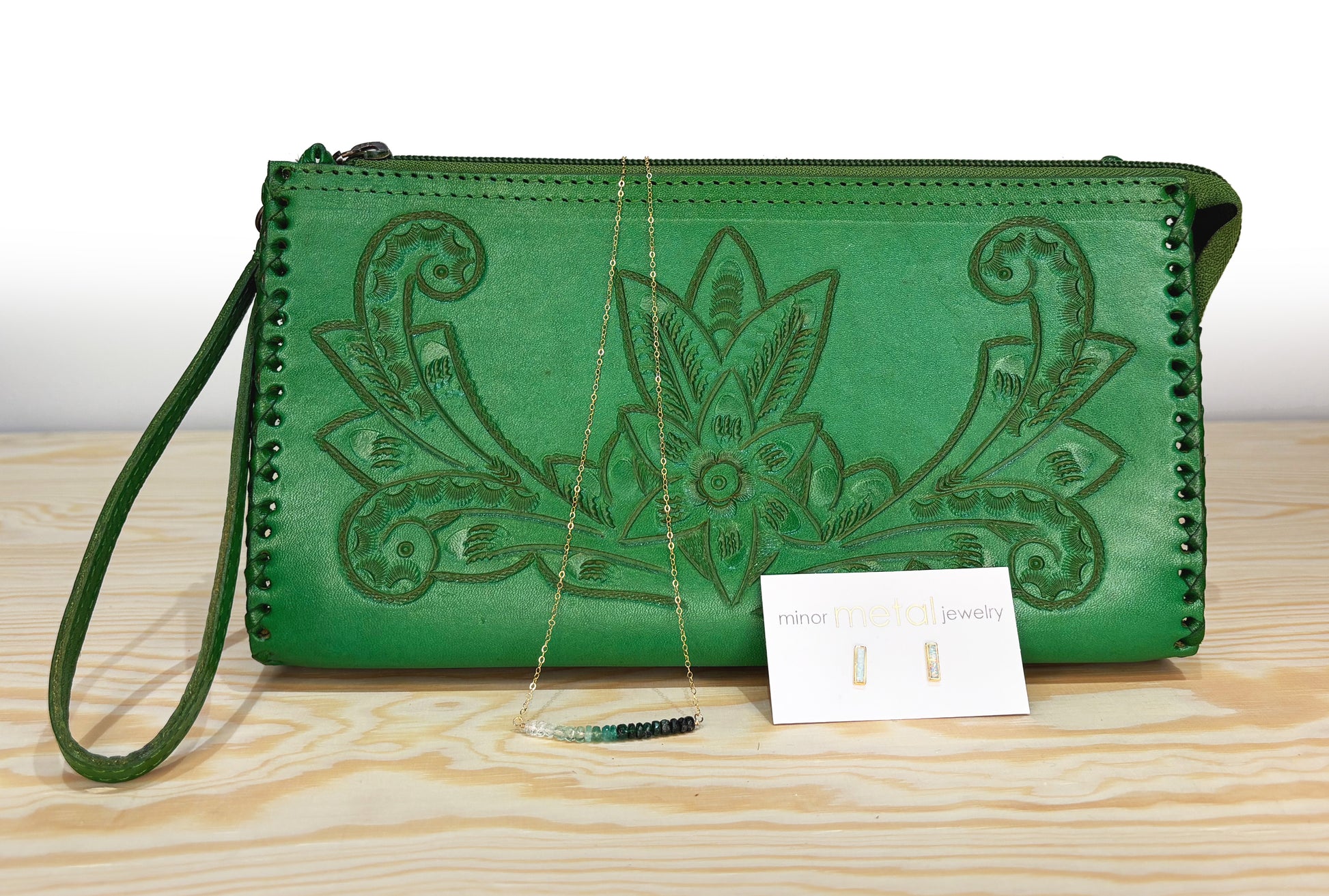 This set is where tradition meets modern sparkle. The green, hand-tooled Ella clutch/crossbody from Kuriosa brings timeless craftsmanship, while Laura Stark’s ombré emerald necklace and Minor Metal’s opal bar studs add a playful shimmer. A bold yet balanced mix, it’s a green-hued celebration of effortless style.