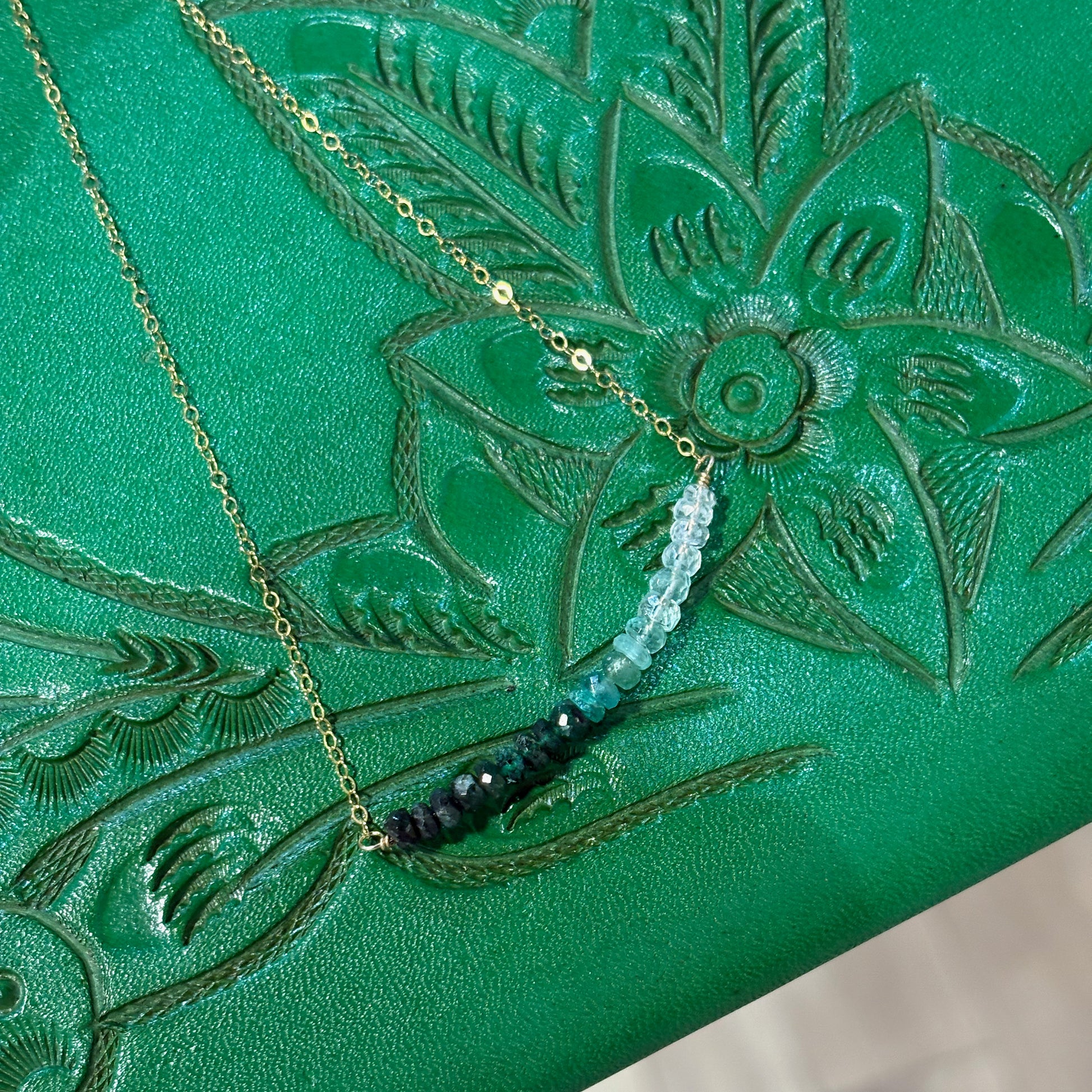 Laura Stark's emerald bar choker is minimalist in design, but not in impact. The light to deep ombre emeralds make a big statement.