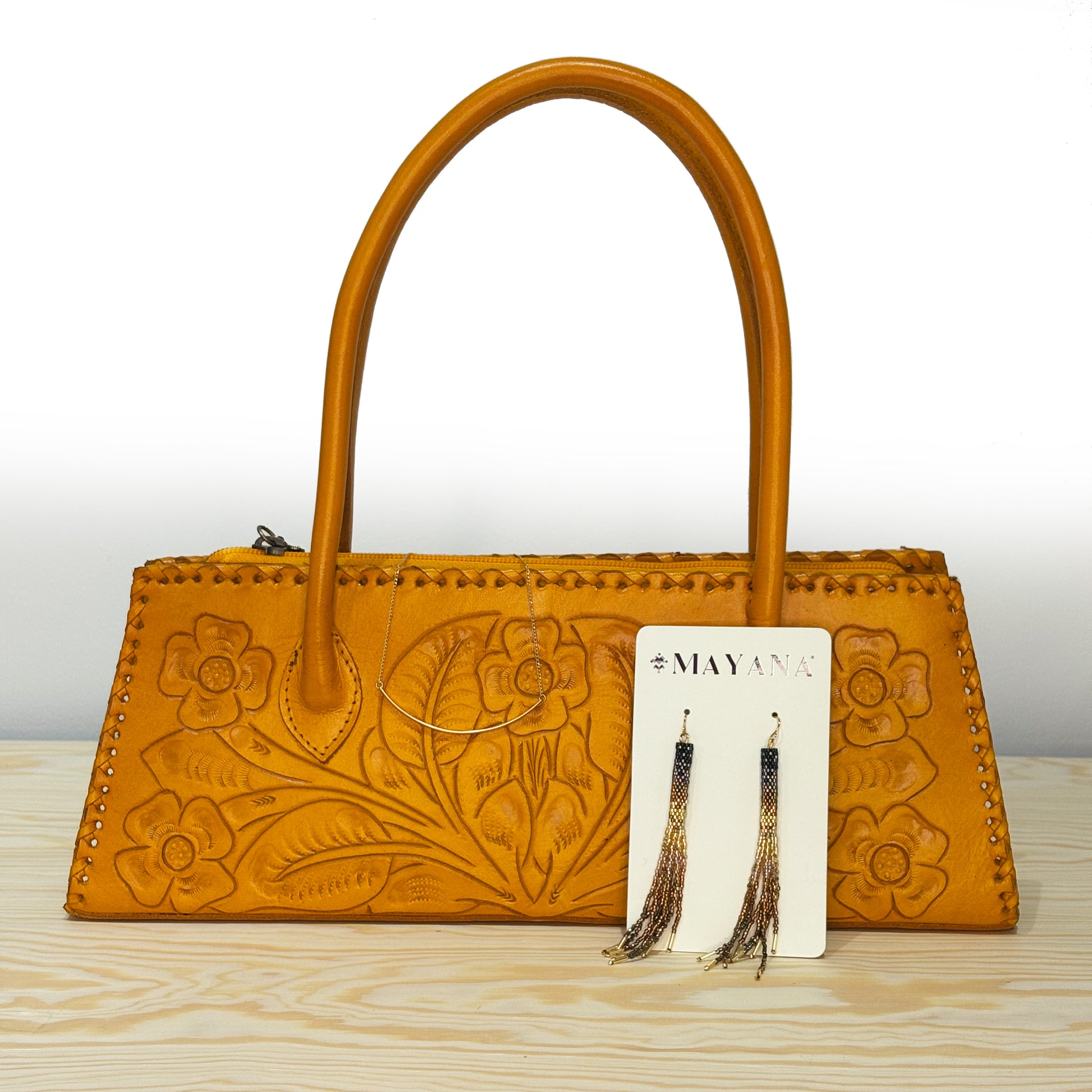 Radiant and unforgettable, this set captures the glow of golden hour in every detail. A hand-tooled Abby Petite handbag in striking yellow steals the spotlight, while Mayana’s flowing tassel earrings shimmer like liquid gold. Finished with Saressa’s minimalist bar choker, it’s a luminous balance of bold and refined, the kind of style that turns every moment into a showstopper.