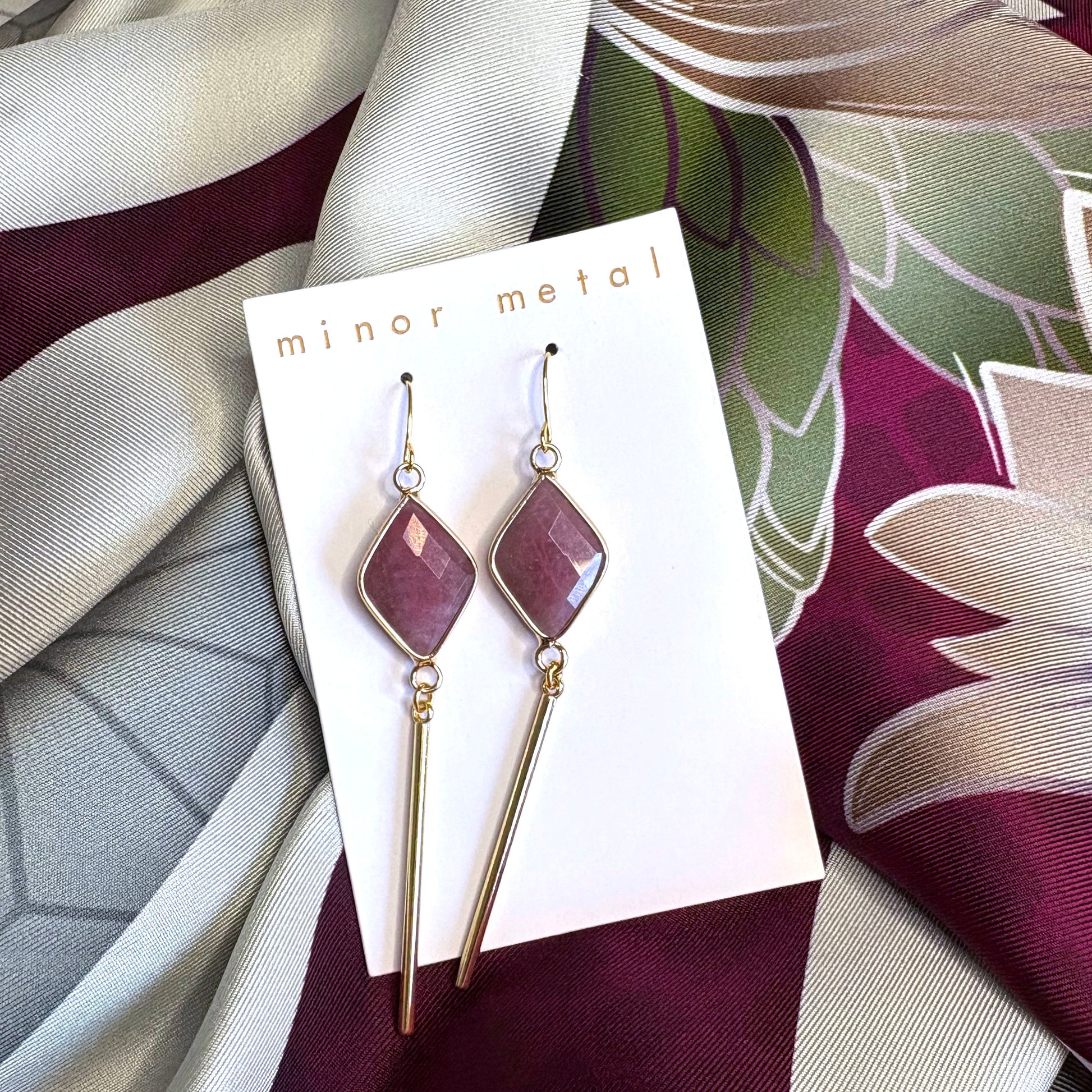 Soft, striking, and full of character. These diamond-shaped Rose Quartz earrings dangle delicately, with a gold bar that adds just the right amount of movement and captures attention.