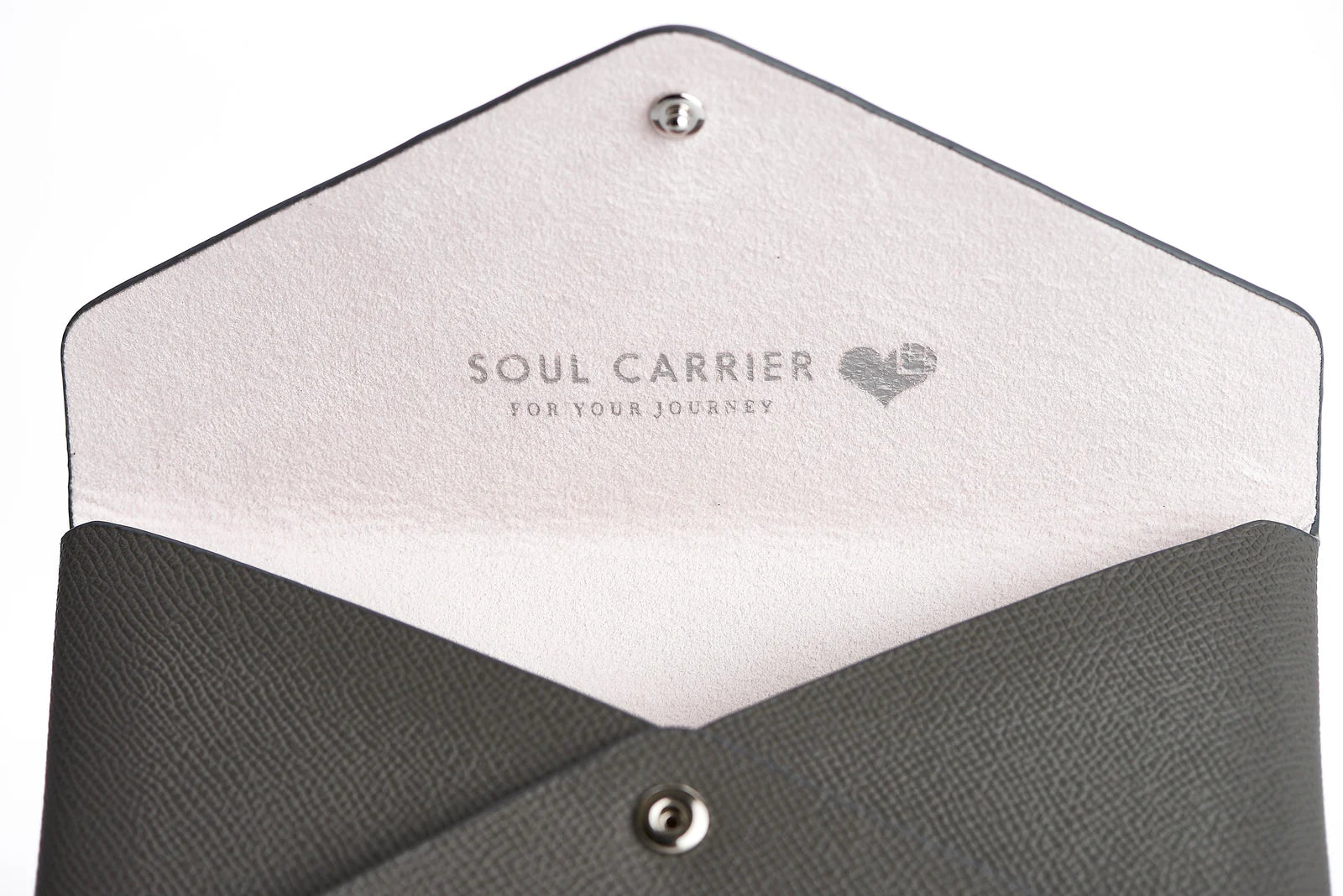 Small but mighty, this Soul Carrier clutch is all about luxe versatility and wrapped up in a sleek, modern style. Handcrafted in Scottsdale, AZ in small batches, it features Hermès-level Epsom leather on the outside and Alcantara (yep, the stuff in luxury sports cars) on the inside.